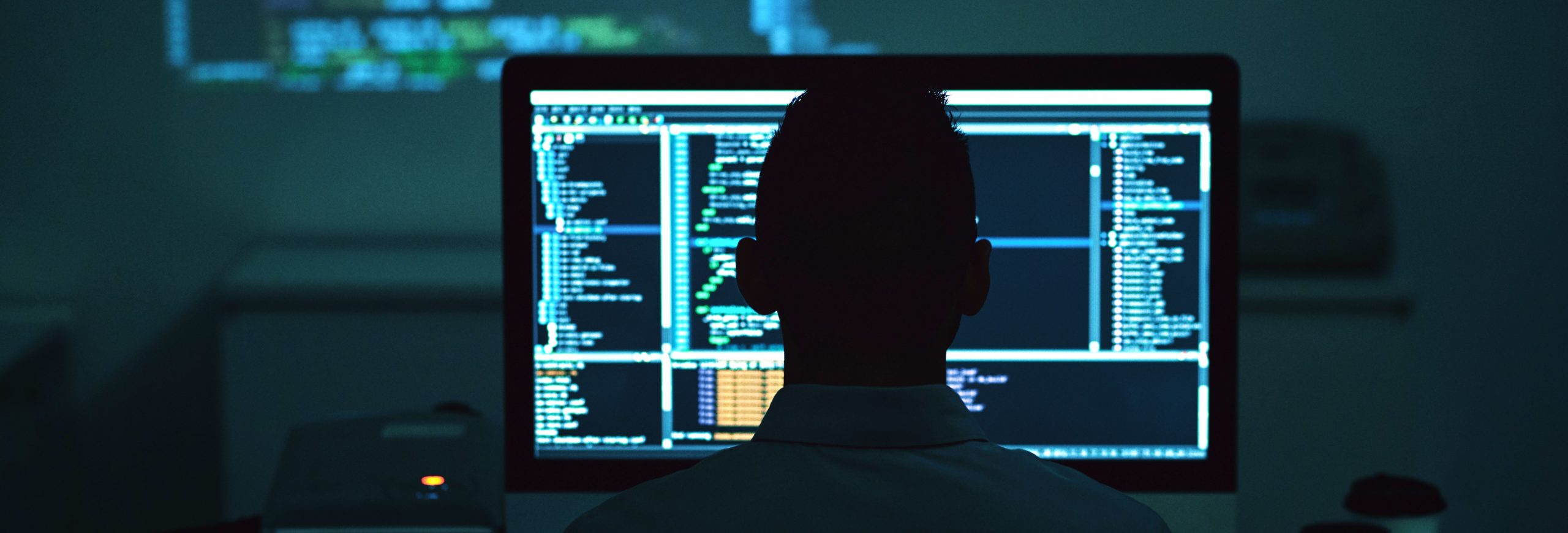 Rear view of programmer working on new project in dark office